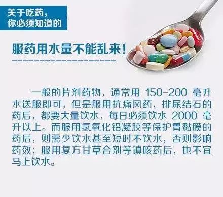 因药物会不同程度损伤肝脏和肾脏,需用水来加速代谢,一般药物,喝60~100毫升的水;服用抗生素类、退热药、止泻药等药物时,每天至少要喝200毫升以上的水。也有服药后5分钟内不喝水的,如止咳糖浆。