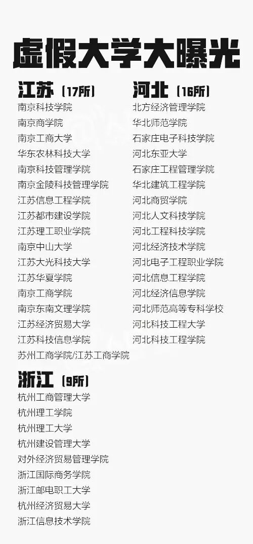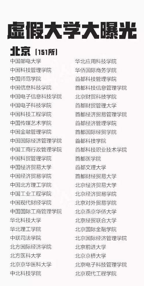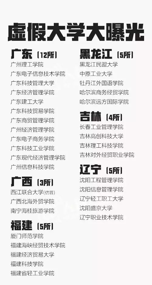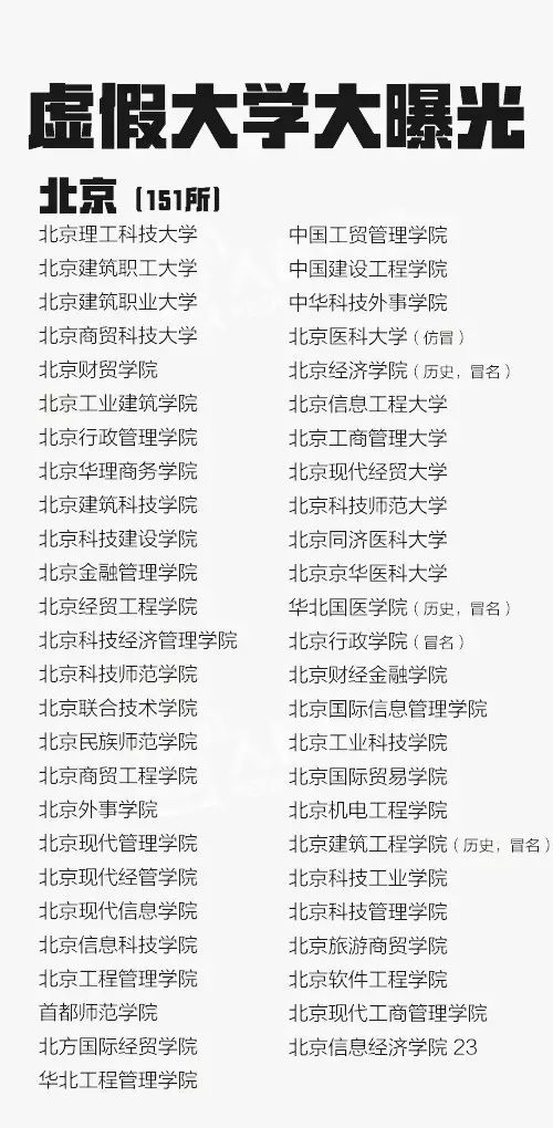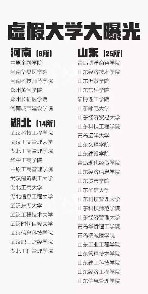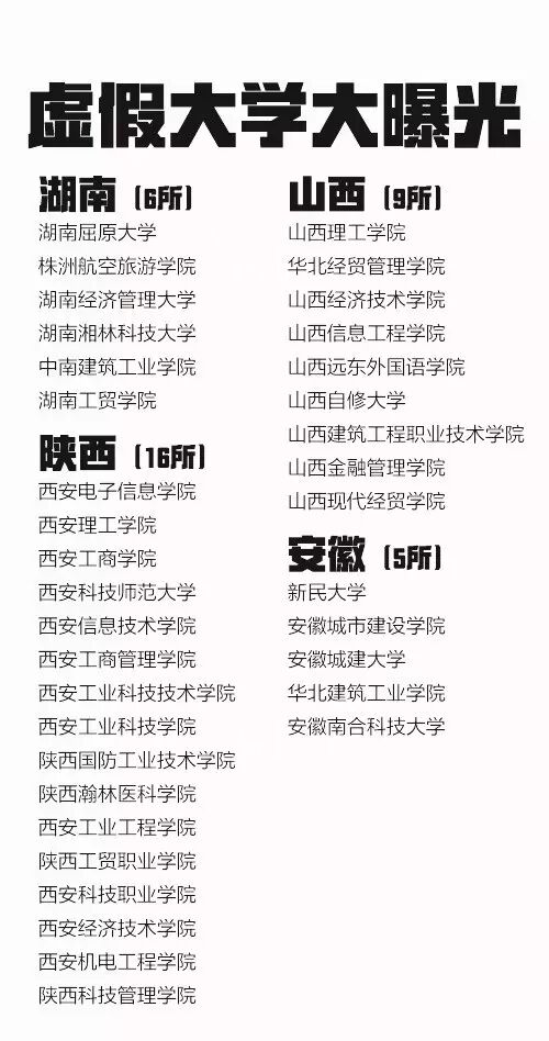 从2013年到2016年共5批虚假大学名单被曝光,一些虚假学校被曝光多次仍换个域名继续存在。这些学校绝大部分仿冒正规高校名称,连学校简介也是抄袭拼凑而来。381所最全名单↓↓转发防止受骗!