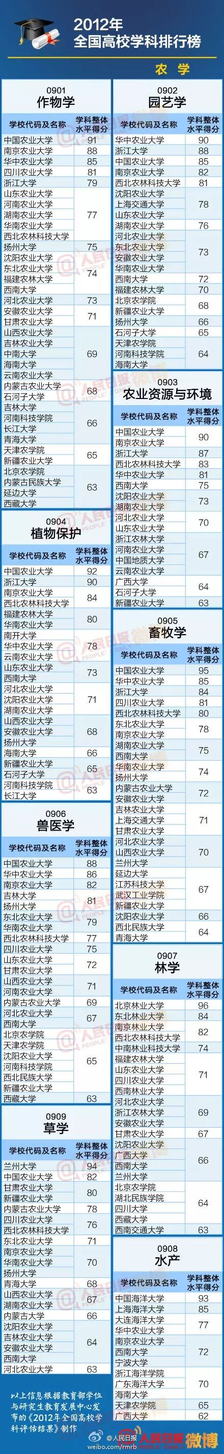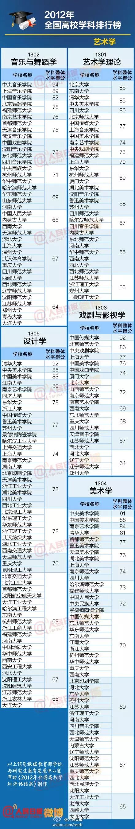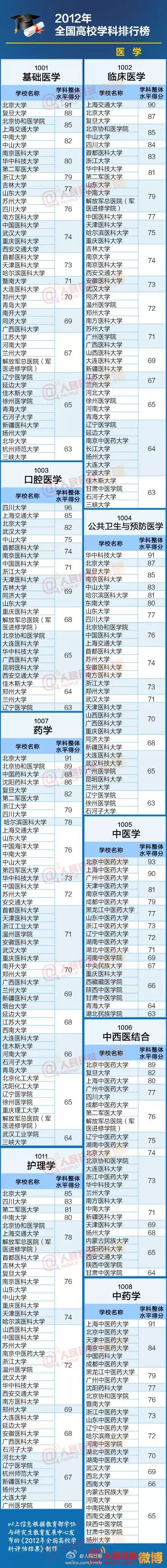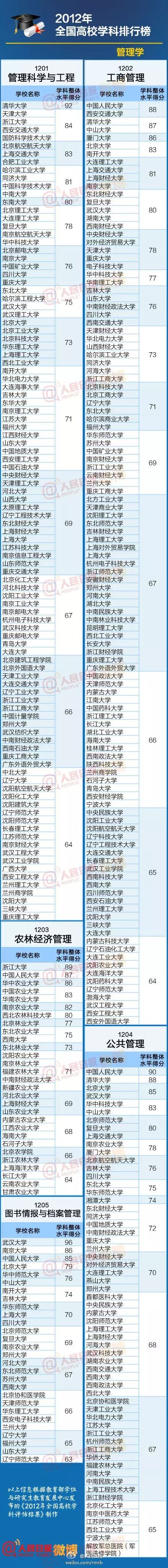 以下名单信息根据教育部学位与研究生教育发展中心发布的《2012年全国高校学科评估结果》制作。这份名单包括七大类,人文社科类、理学、工学、医学、农学、管理学、艺术学。一起来看看,各个专业哪家强?