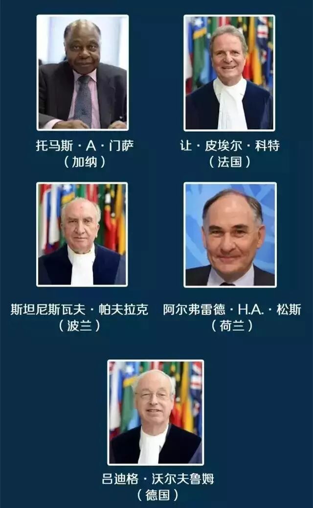 国际海洋法法庭时任庭长柳井俊二在接受菲律宾2013年1月强行提出的仲裁案后,于当年5月组成由五名专业人士组成的仲裁庭。根据仲裁庭书记处公布的消息,五人临时仲裁庭包括: