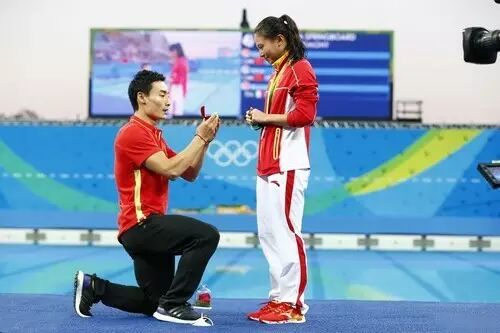 8月14日,跳水女子3米板决赛,何姿夺得银牌,在颁奖礼上,男子双人跳水3米板铜牌得主秦凯向何姿求婚。